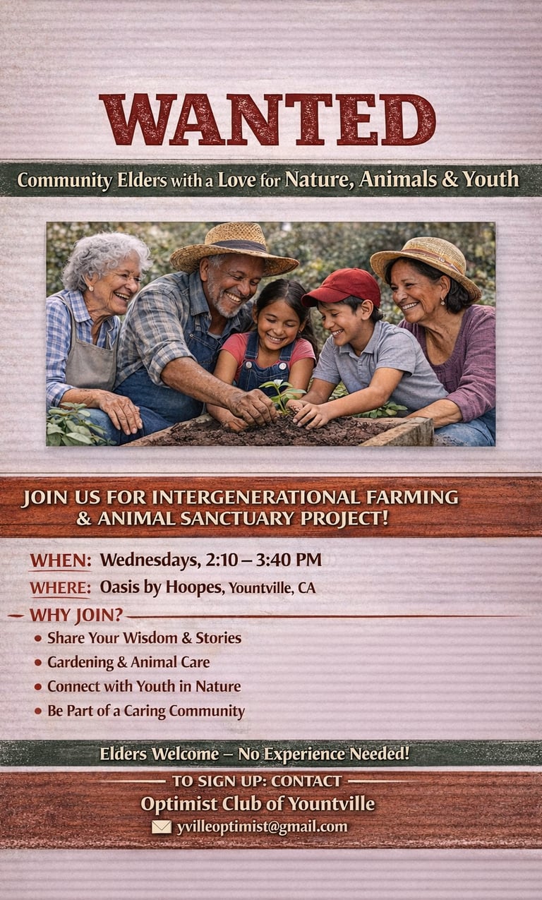 Optimist club is set to launch it's generational farming project. We are still recruiting elders from Yountville to participate, though so far we have had a good response. Please email us if you are interested in volunteering at: yvilleoptimist@gmail.com.